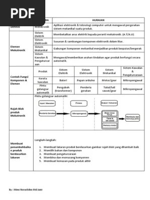 Nota tentang fungsi elemen mekatronik. Bab 1.1 reka bentuk mekatronik bab 2 pembangunan produk bab 3 reka . Sila baca, faham, dan ingat. Mekatronik aspek perkara huraian definisi mekatronik aplikasi elektronik & teknologi computer untuk mengawal . Reka bentuk dan teknologi (rbt) grade/level: